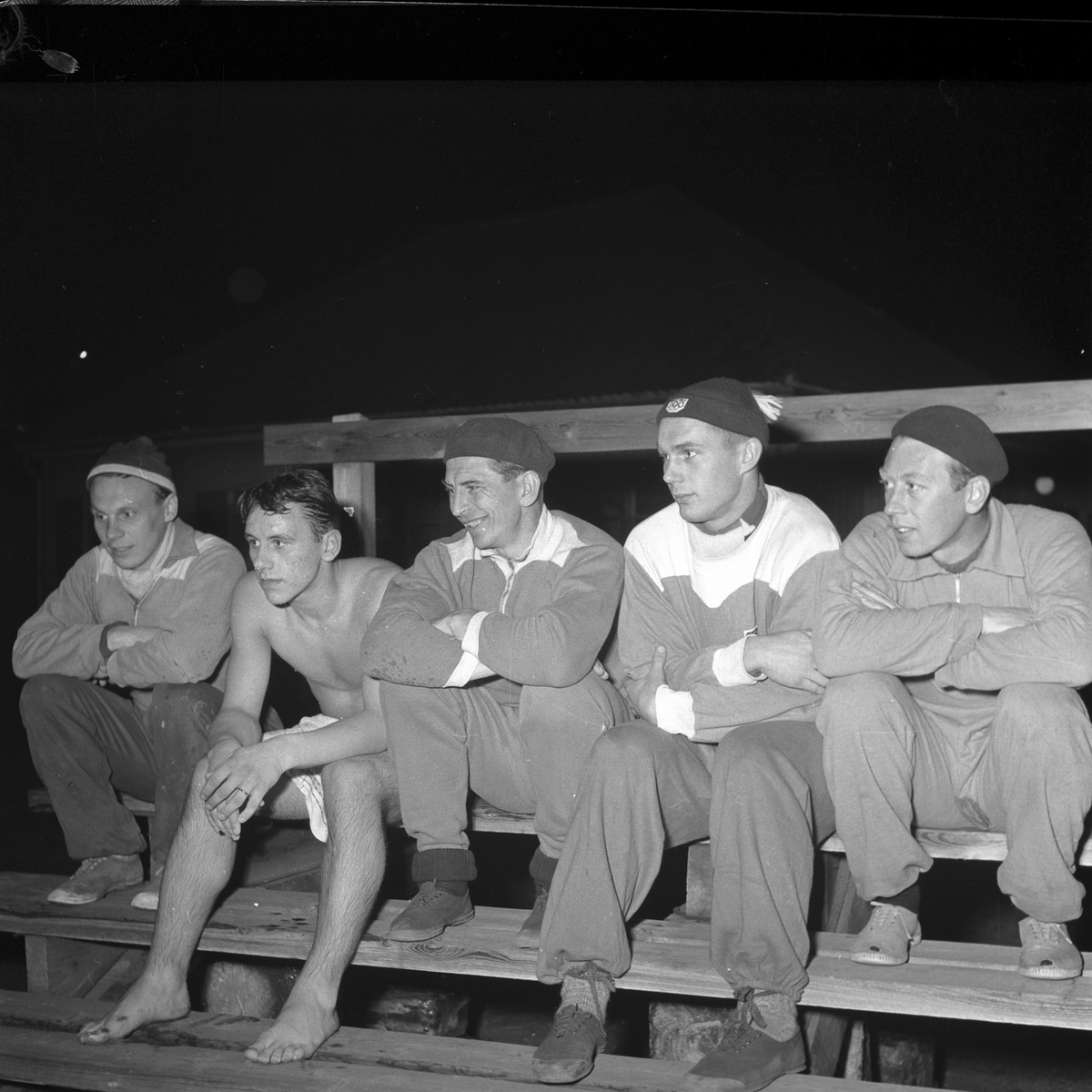 SAIK tränar bandy. Från vänster "Nicko" Andersson, Kjell Edlund, Einar Ask, Gunnar Åberg och Agard Magnusson. Reportage för Aftonbladet. Den 29 oktober 1953.