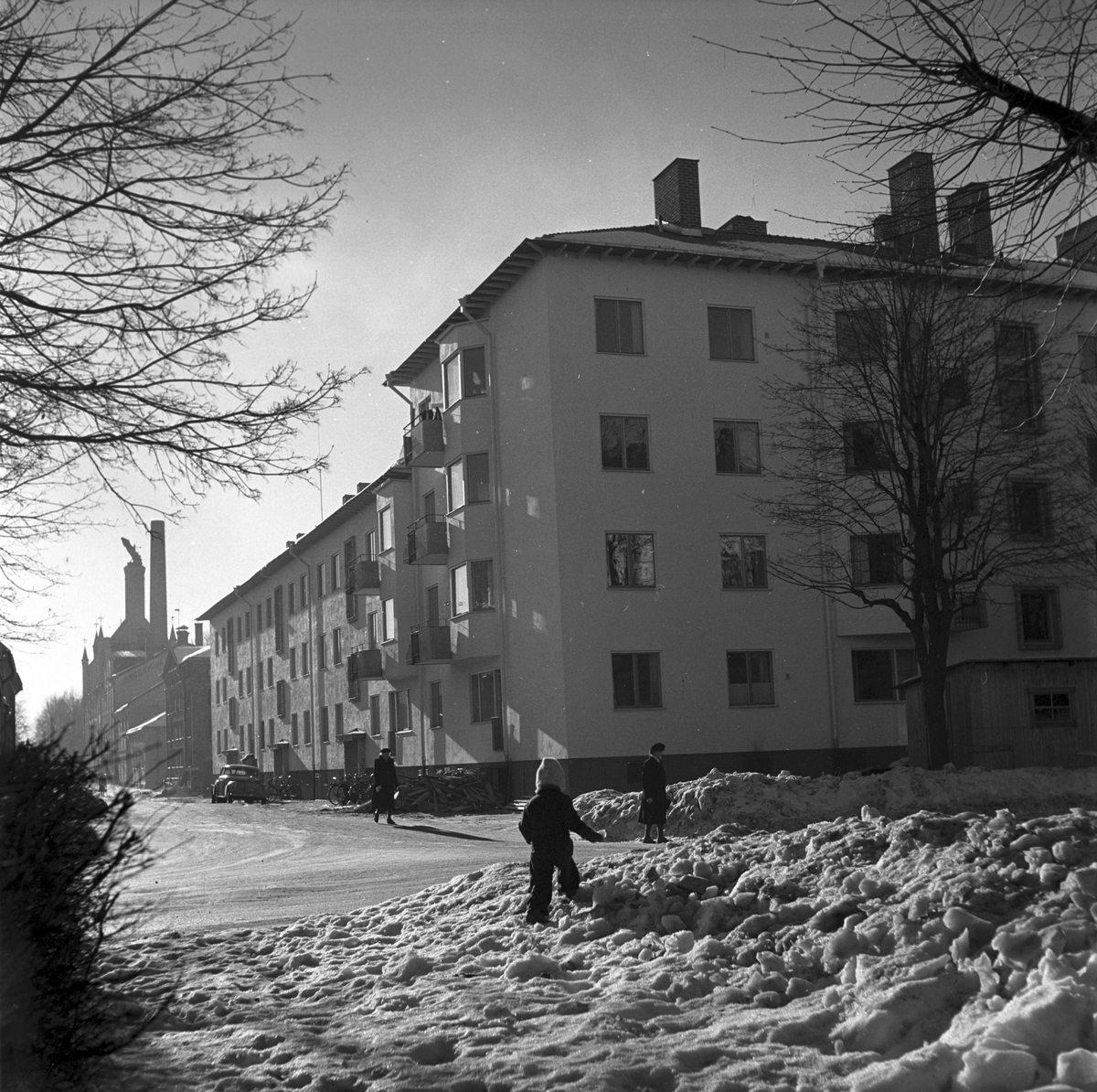 Stadsvy över nybyggdfastigheter, korsningen, Skomarkargatan/Staketgatan. 1948.