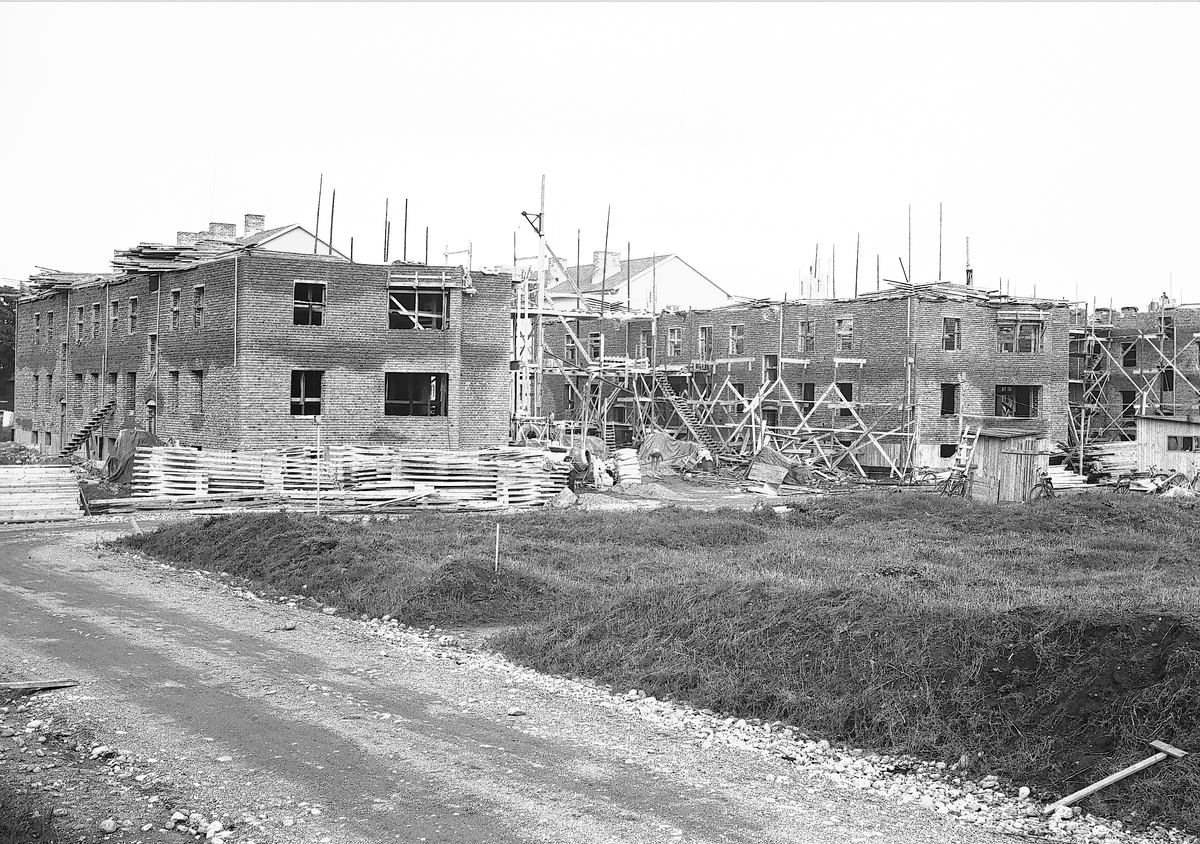 Bostadsyggnader under uppförande på Södra Stapeltorgsgatan 5 - 9, med nr 5 närmast. Kvarteret Stettin nr 1, 11 och 10. Fotot är taget mot öster. En del av Brunnsparken syns i förgrunden.