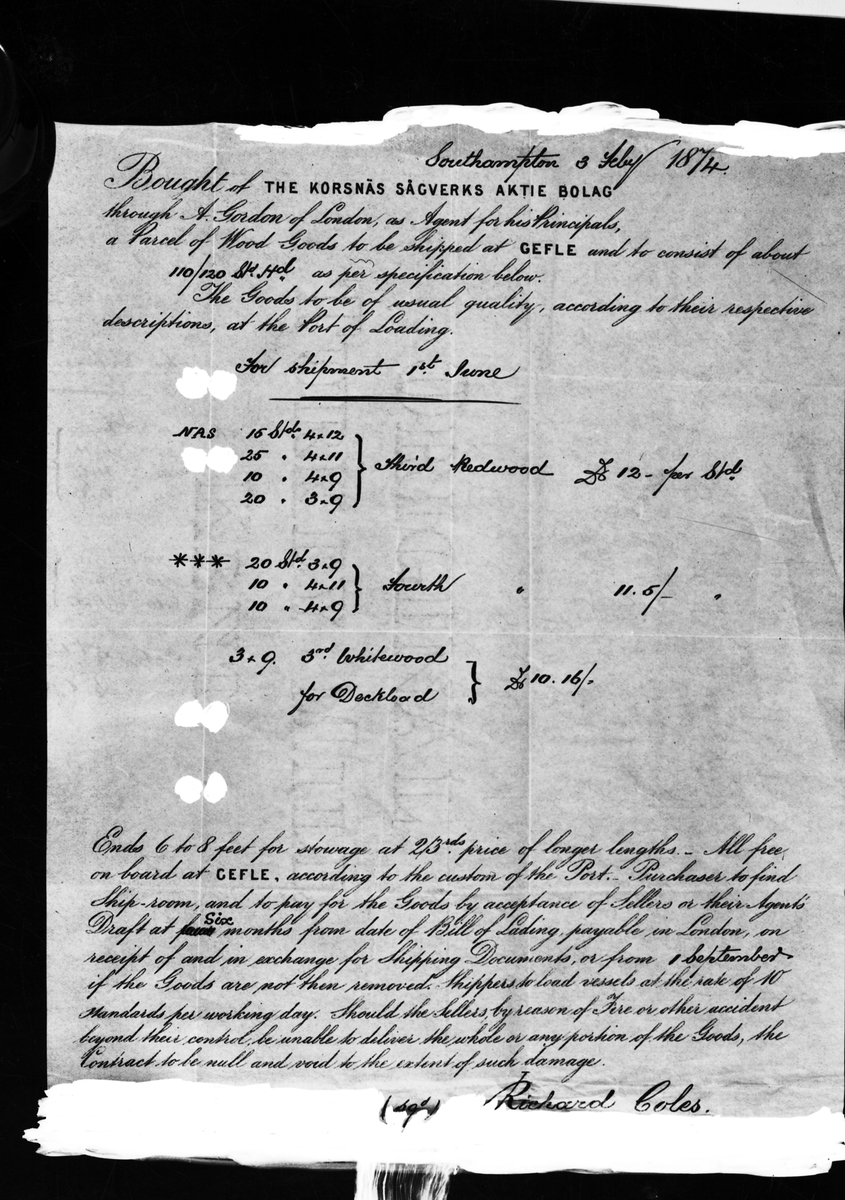 Köpeavtal från Southampton till Korsnäs Sågverk AB. 18 april, okänt år
