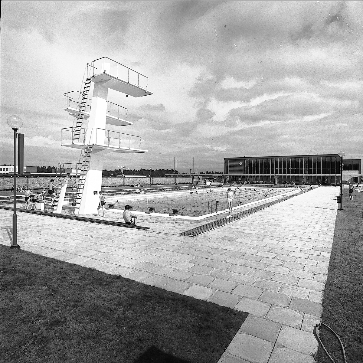 Den 19 augusti 1964. Sporthallen. Utomhusbassängen med hopptorn. Södra Valbo.