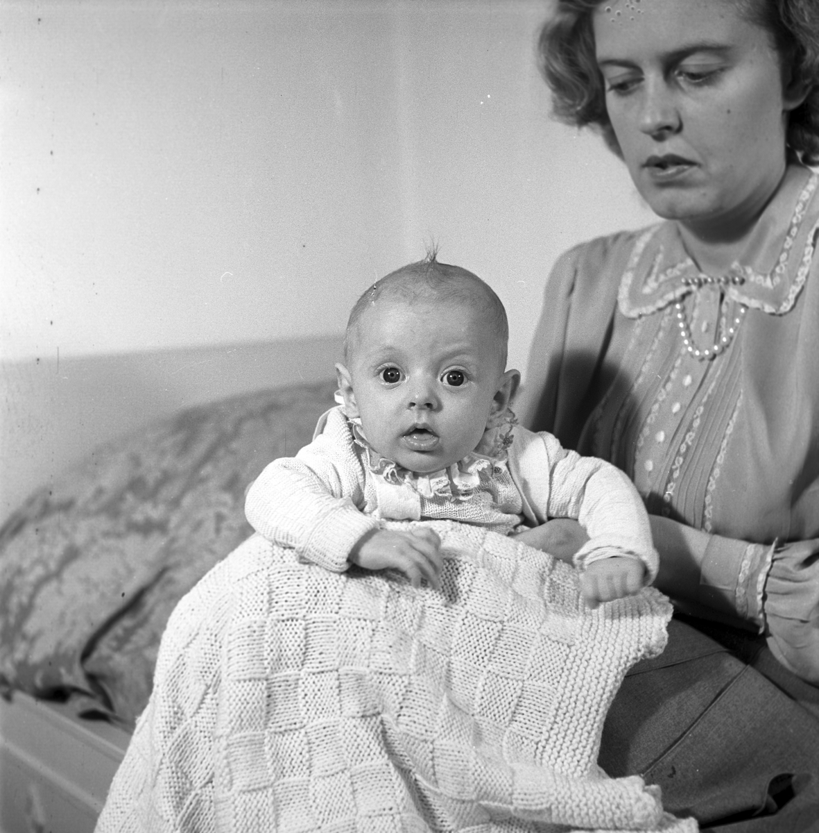 Baby fotograferad i bostaden. December 1947. Fru Ekman sonhustru.