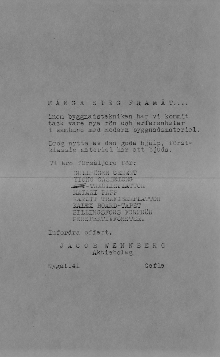 Informationsbrev från Jacob Wennberg AB som rör nybyggen vid Valbogatan Gävle. November 1944.