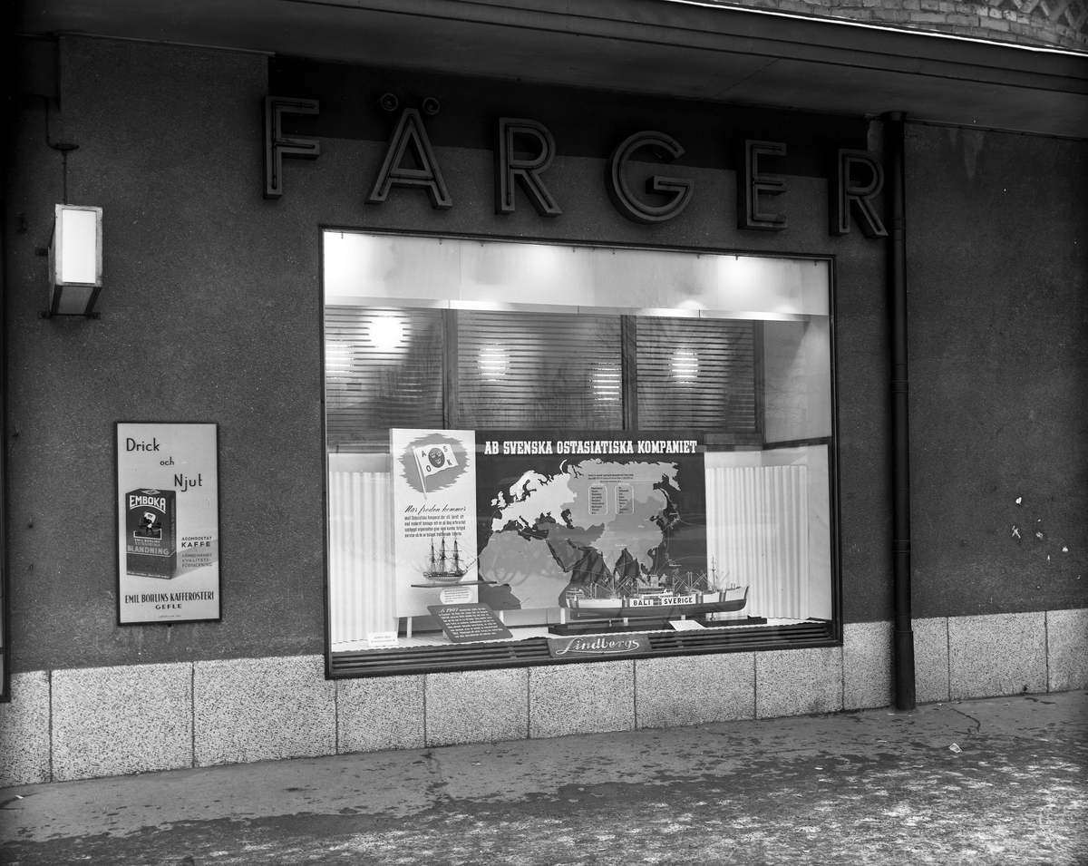 Modellbåt "Bali" i Lindbergs Färghandel skyltfönster. 25 november 1944. Andersson & Lundqvist, Norra Skeppsbron 7, Gävle.