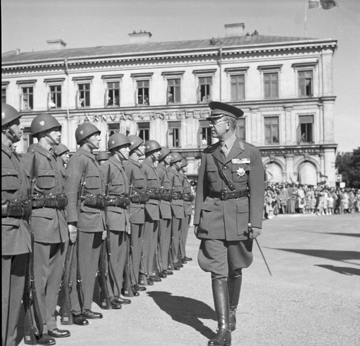 Avslutande dagar på utställningen 1946. Kungen inspekterar framför Centralstationen. Med anledning av Gävle stads 500-årsjubileum