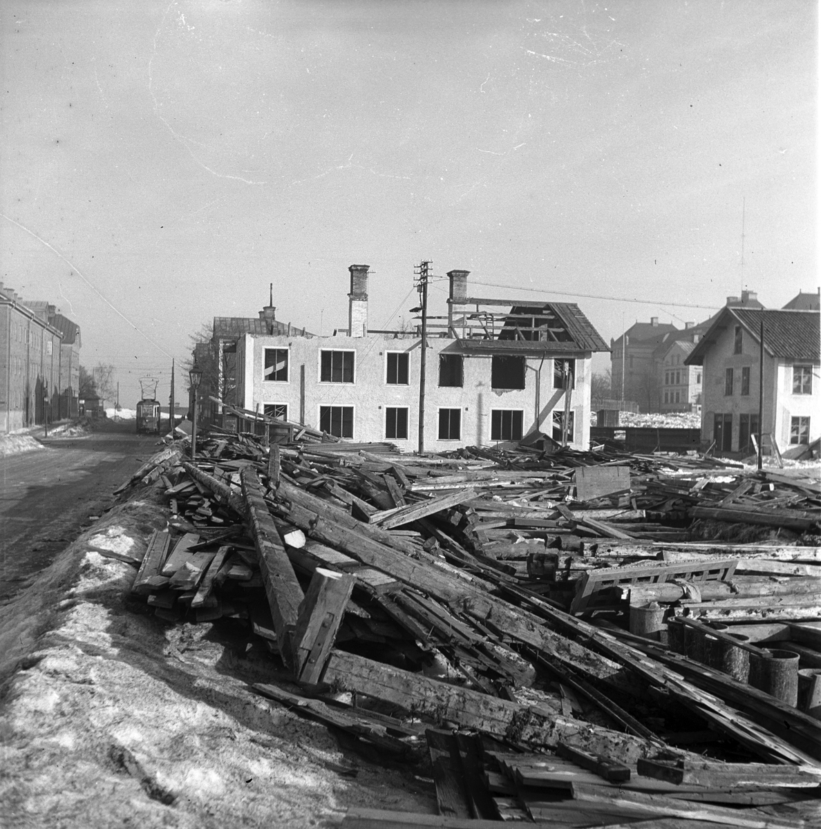 Rivning av gård på Brynäs för nya punkthus. 1947. Reportage för Norrlands-Posten.