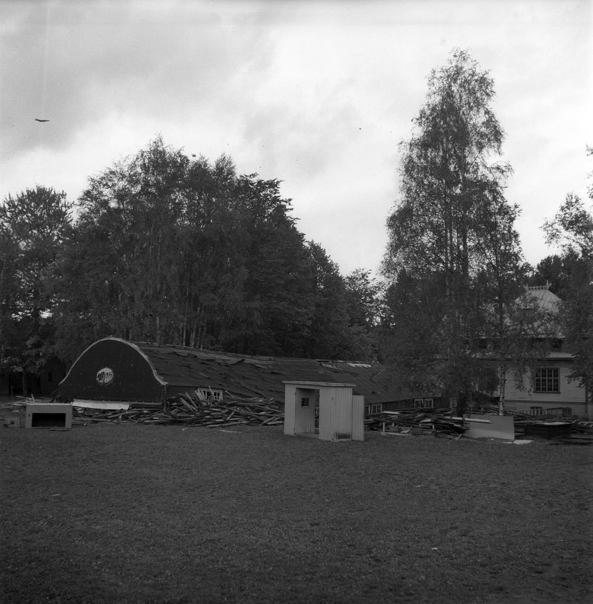 Titel: Strömdalen "ladan". Augusti 1945. Värdshuset låg mellan nuvarande Silvanum och Strömvallen. Många Gävlebor minns ännu danserna, soldatfesterna och sommar-teatern. Tidigare hölls möten och föredrag av kända socialister vid värdshuset sedan arbetarrörelsen i Gävle 1904 köpt det för att förvandla fastigheten, då om-fattade drygt 18.000 kvadratmeter, till folkpark. Utöver huvudbyggnaden fanns en lada som förvandlats till dans-palats, kägelbana och musikpaviljong. Dess nya funktion invigdes 1905 med tal av Hjalmar Branting, senare gästades värdshuset av andra socialdemokratiska agitatorer som Kata Dahlström, August Palm och Fabian Månsson. Arbetarrörelsen drev restaurangen och arrangerade teaterföreställningar och konserter, hade expedition och möteslokaler i huset. Värdshuset såldes 1911 till Gävle stad som överlät skötseln till skarpskytte-rörelsen, senare privata arrendatorer. Då första världs-kriget bröt ut 1914 stängdes värdshuset. Under en tid användes dansladan som sjukhus för soldater som drabbats av röda hund. Efter kriget blev Strömdalens värdshus åter dansrestaurang och var i många år mycket populär. 1952 startades en friluftsteater som spelade lustspel på somrarna. 1957 upphörde verksam-heten och det slitna huset revs 1958 då tomtmarken behövdes för bygget av Silvanum. Det ursprungliga värdshuset byggdes 1888 av trä i två våningar och en vindsvåning på den plats där bondgården Strömdalen legat. Runt framsidan och ena gaveln en veranda för sommarservering, i parken låg två kägelbanor och en musikpaviljong (som revs i början av 1950-talet). Huset brann 1894, och året därpå invigdes en ny byggnad med annan utformning, ritat av arkitekten Hugo Rahm. I nedre våningen inreddes en stor matsal med estrad, en väggmålning av målarmästare Bylander med de fyra årstiderna som motiv prydde salen. Byggnaden såldes 1898 av Strömdalens Värdshus AB till Zetterströms Vin-handel AB och arrenderades av olika källarmästare, däri-bland Carl Johan Berglund, tills den såldes 1904. Från Gästrikland 1991-1992; Sterner, J: Gatunamn och Gävle-historia (Från Gästrikland 1997); Sjöström, V, med flera: Minns du det än.