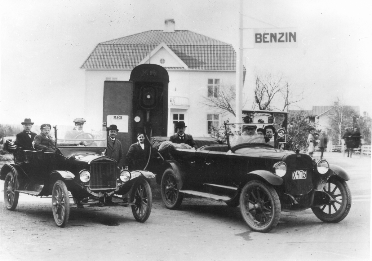 Två bilar utanför en bensinstation. Den ena med registreringsnummer X475.