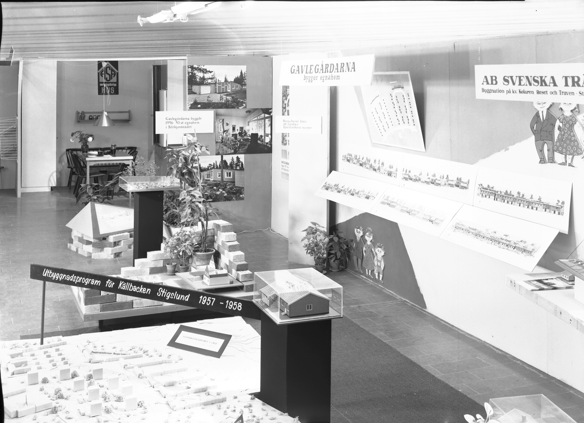 Den 17 oktober 1957.Gavlegårdarnas monter för utbyggnad i Stigslund 1957-1958 i utställningshallen.