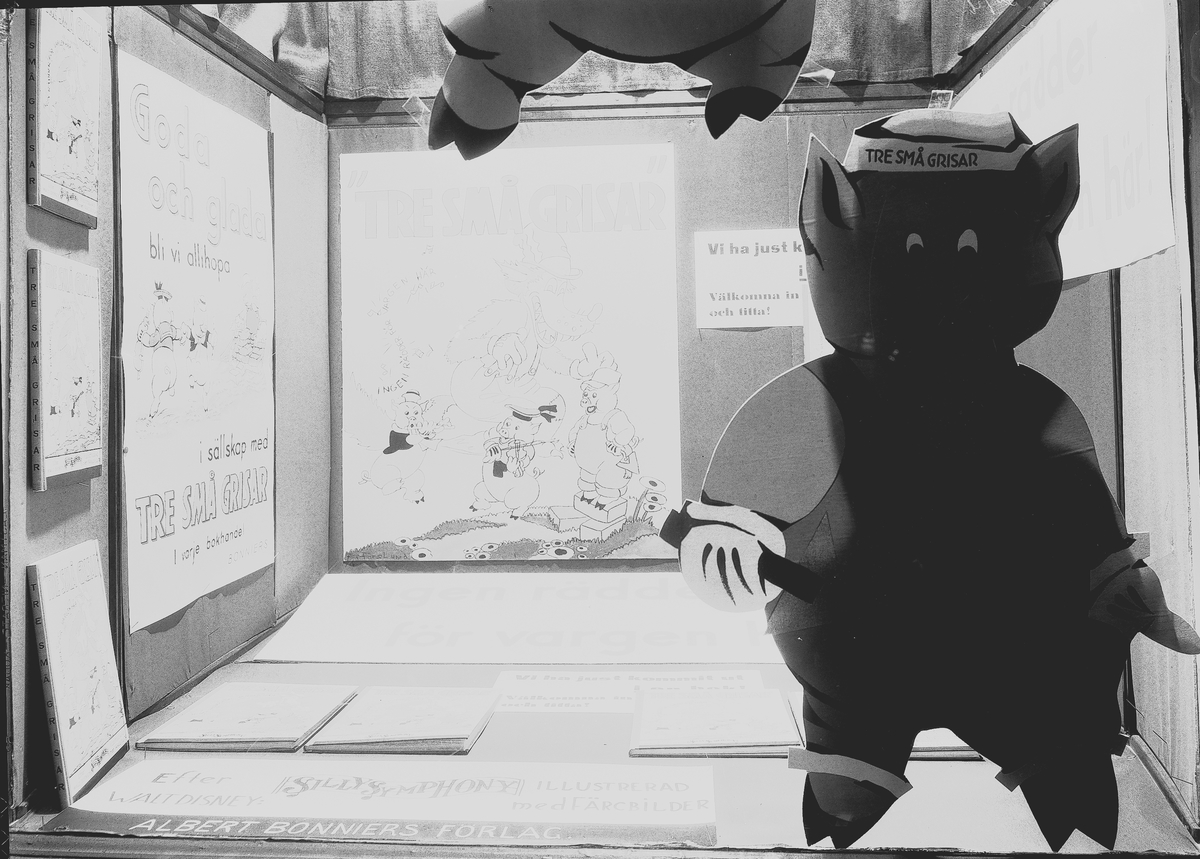 Hedmans Bokhandel. Skyltfönstertemat är "Tre Små Grisar"