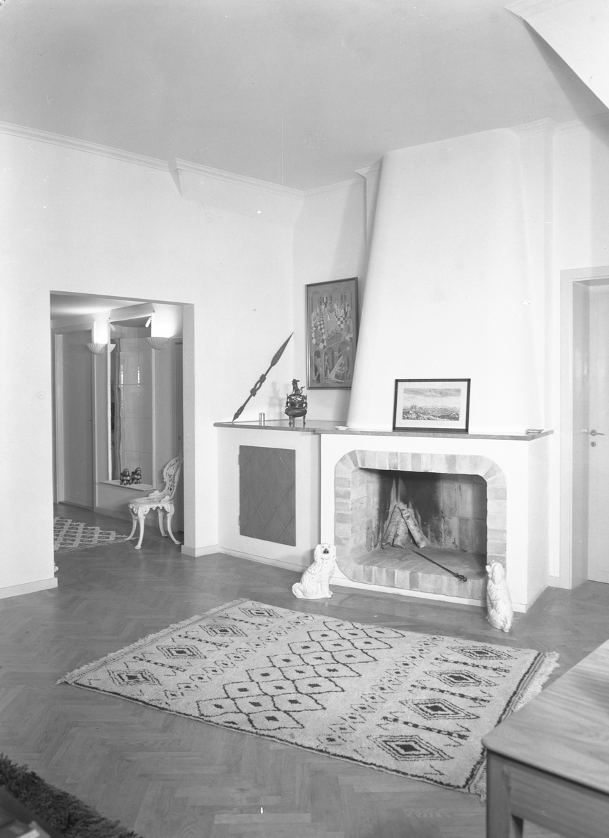 För boken "Svenska Hem i ord och bilder". Hos Direktörsassistenten vid Gävle Ångväveri Bengt Müller. Den öppna spisen i vardagsrummet med den kamoflerade vedlåren till vänster