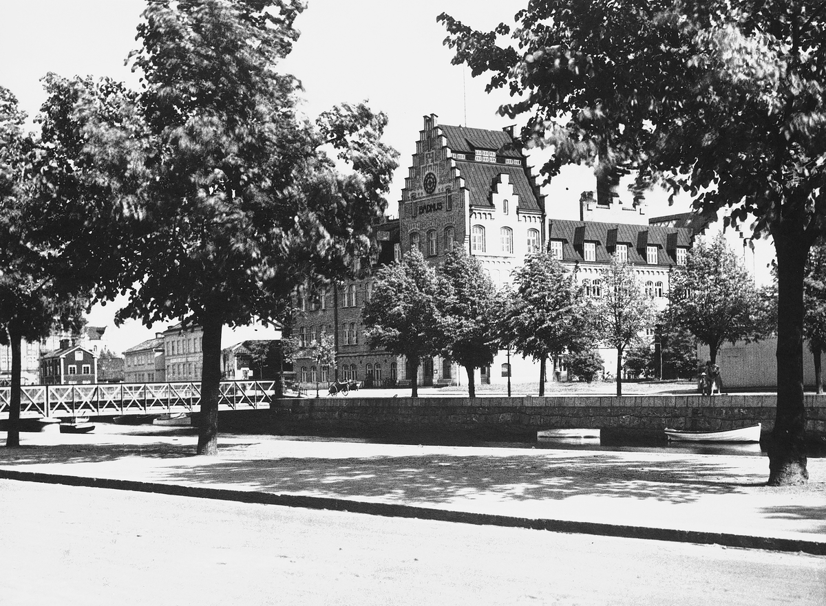 Vy från Norra Strandgatan över Murenska Badhuset. Murenska badet invigdes 1907. Ritat av Ture Stenberg