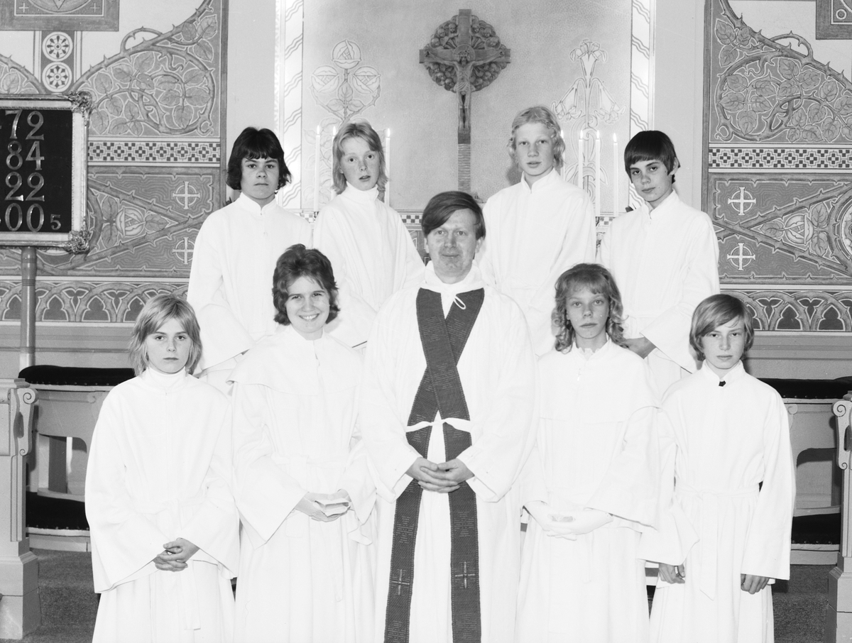 Prästen Larsson med sin konfirmander i Soldatkyrkan, den 29 maj 1971