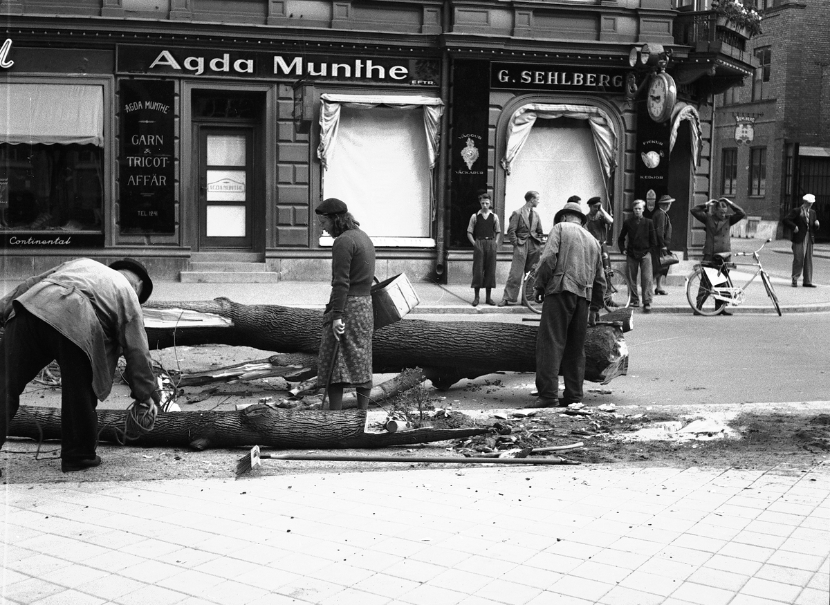 Män som mäter träd, kvinna som samlar "ved". Augusti 1940. "Gefle Dagblad"