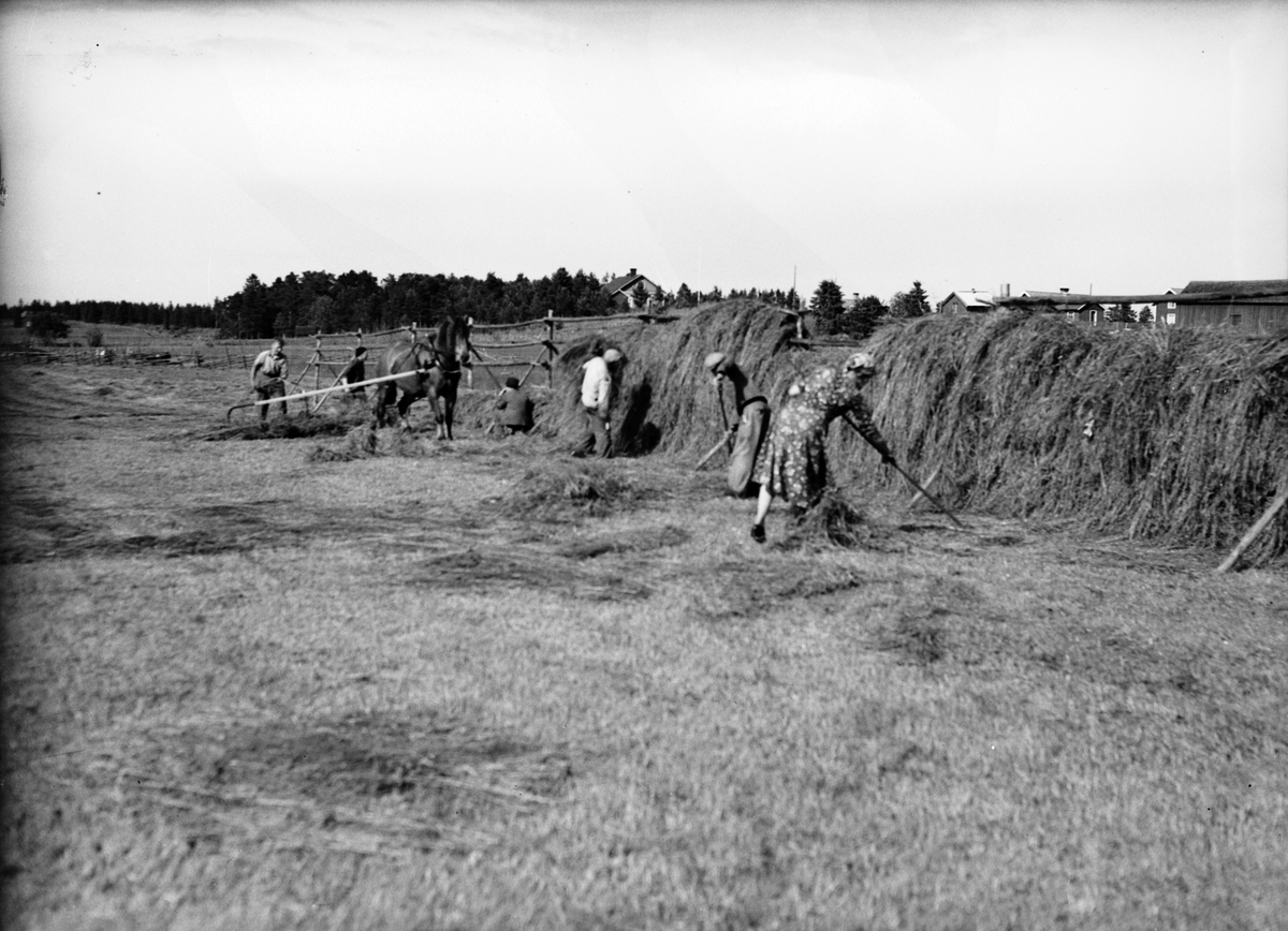 Höslåtter på gården Jon-Jons i Trödje den 13 juli 1939. Gården ägdes av systrarna Stina och Karin Jonsson. Reportage för Norrlandsposten.