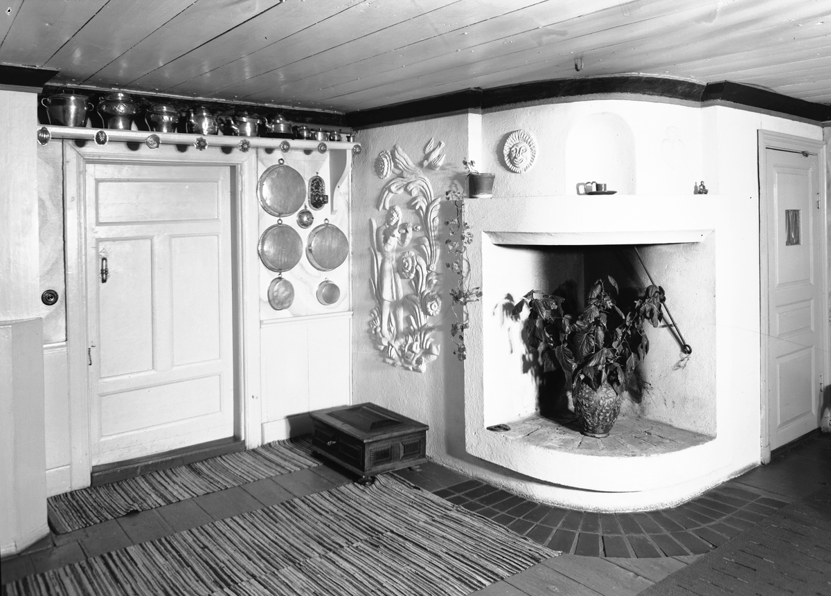 Från boken "Svenska Hem i ord och bilder" från 1944. Hemma hos Konstnären Manne Östlund, ägaren till Jons i Västbyggeby. Den öppna spisen med stuckrelief av Manne Östlund. På golvet skrinet för gårdsarkivet.