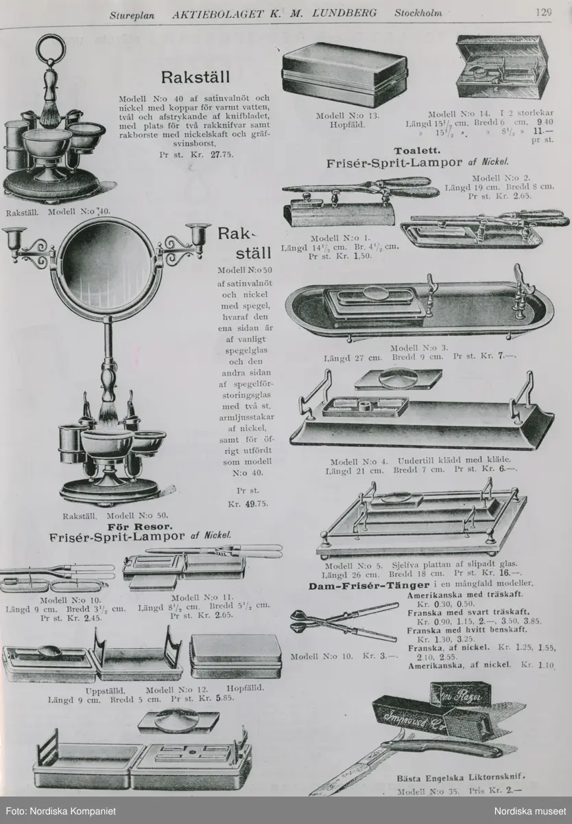Avfotograferad katalogsida med rakdon samt frisértänger och spritlampor. Nordiska Kompaniet. På baksidan med blyerts: "K.M. Lundberg Katalog 1901"