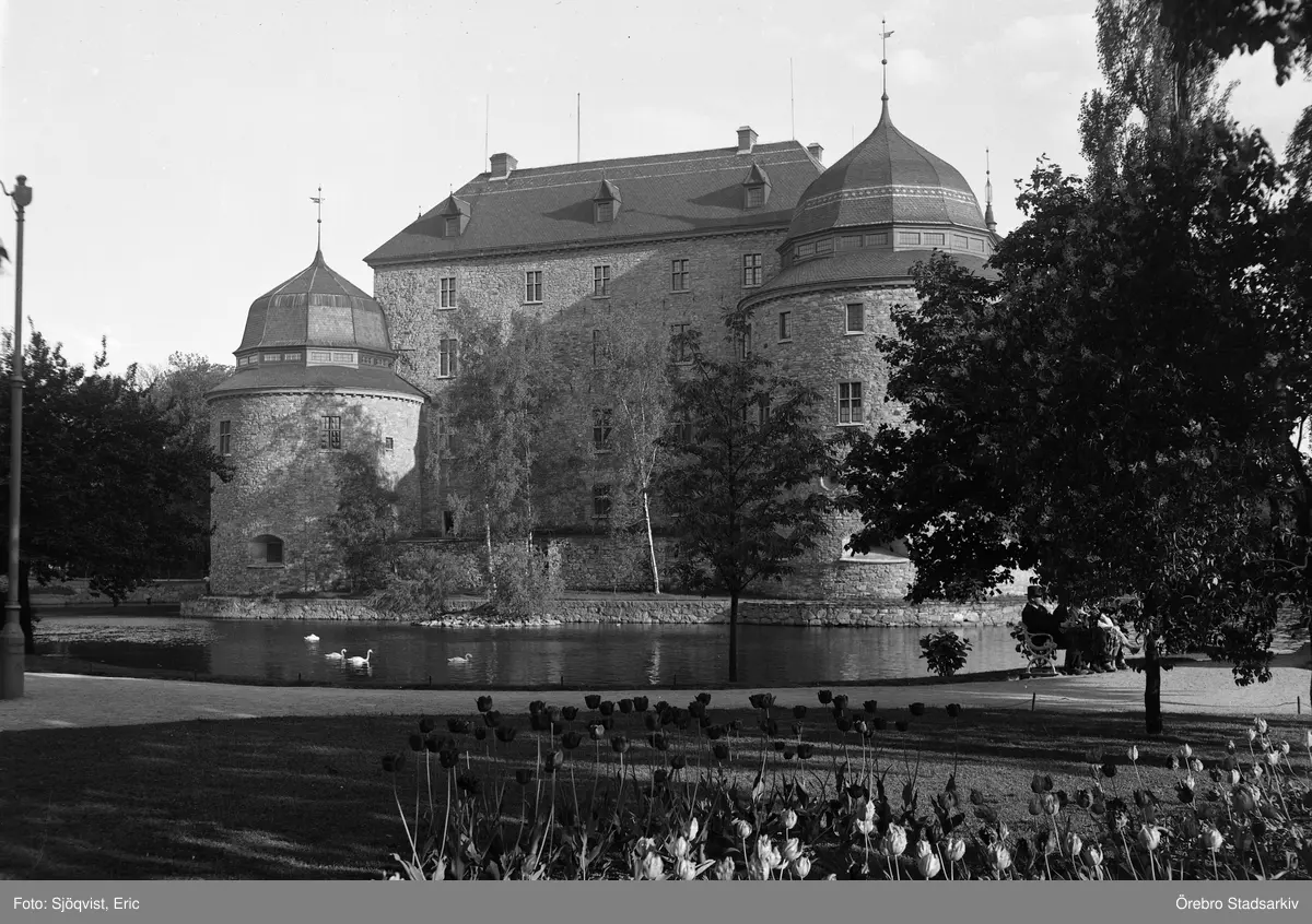 Svanar simmar i Svartån mellan Örebro slott och Centralparken, 1930-tal