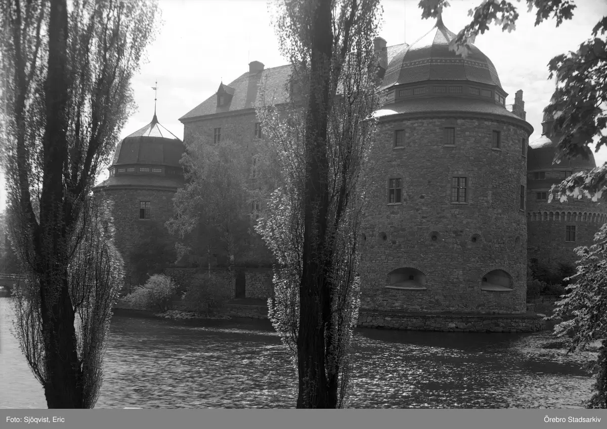 Örebro slott från sett genom centralparkens träd, 1930-tal