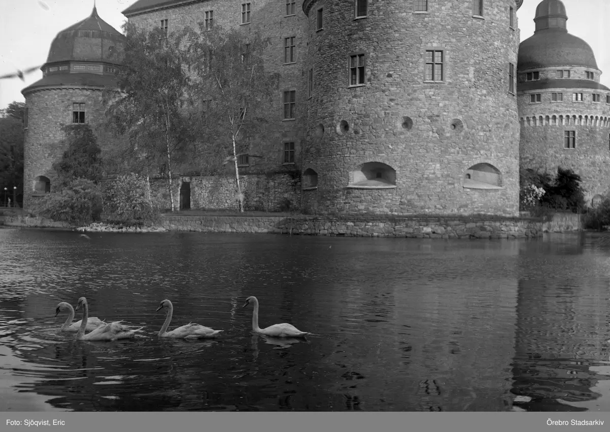 Svanar simmar mot väster framför Örebro slott, 1930-tal