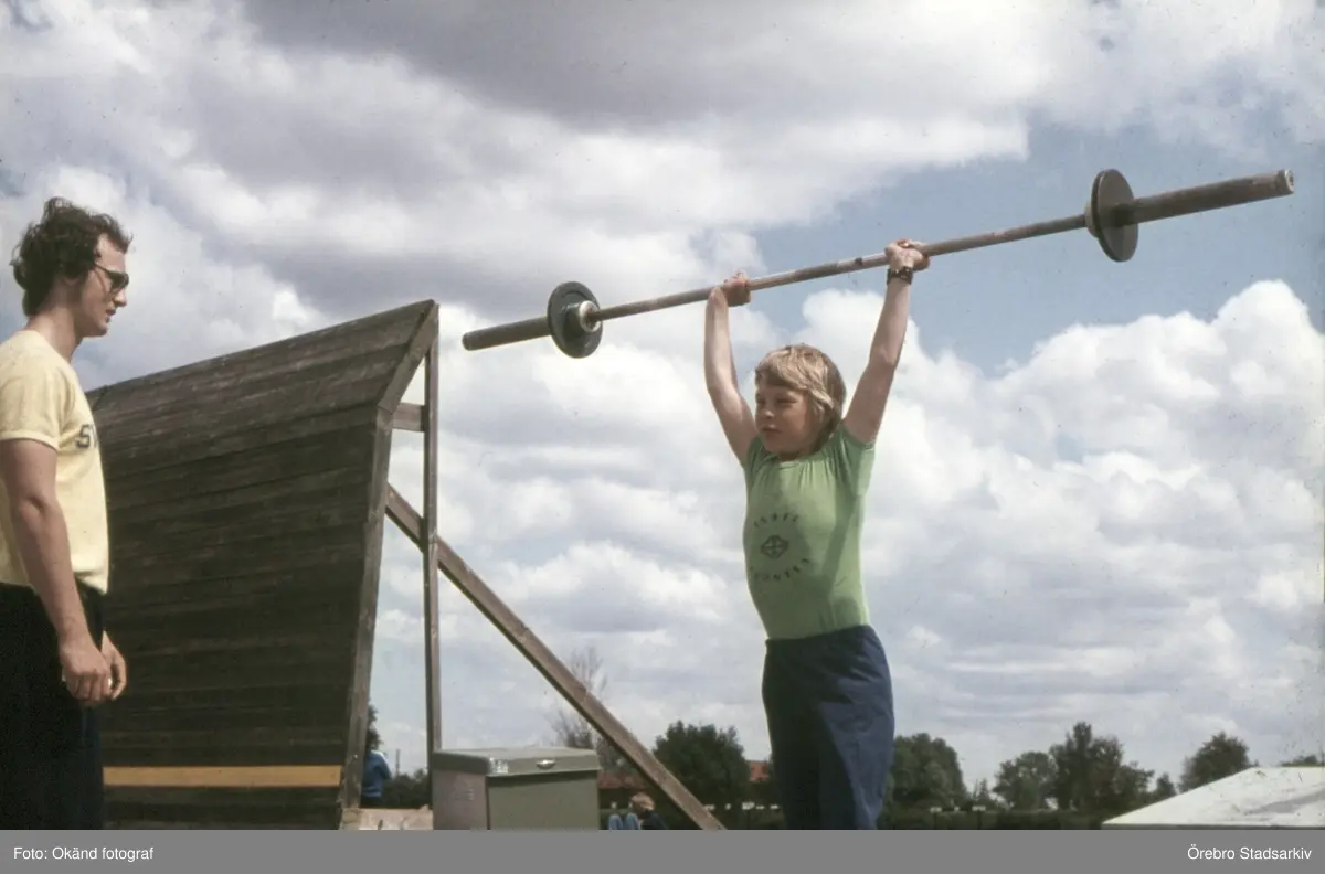 Ung man provar tyngdlyftning med instruktör, 1970-tal