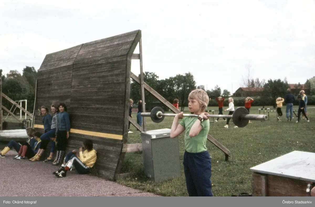 Utövare av olia idrotter, tyngdlyftning,häcklöpning och fotboll medan några vilar, 1970-tal