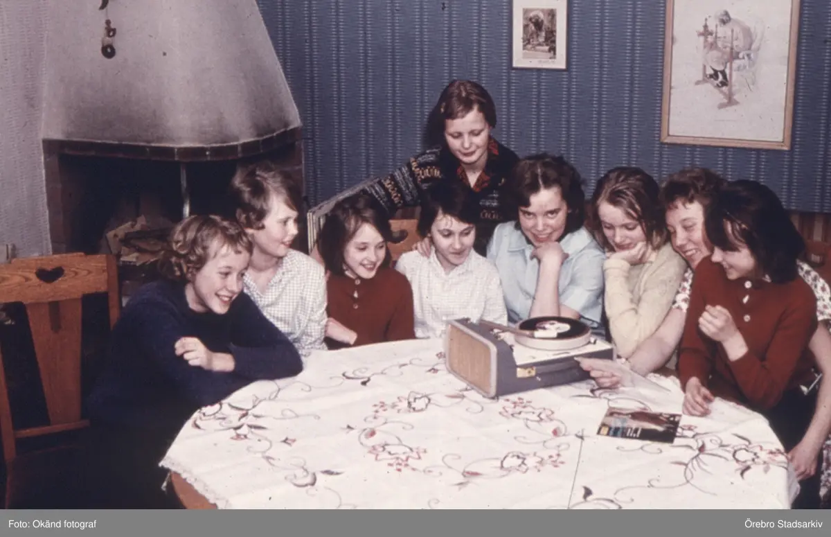 Flickor samlade runt grammofon på ungdomsgård i Örebro, 1950-tal
