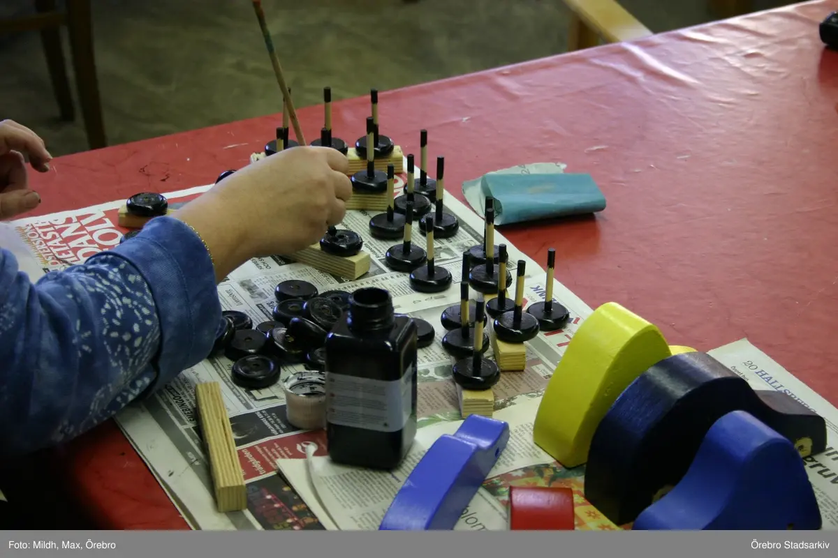 På arbetsterapin målas hjulparen svarta till bilarnas starka färger, 2005