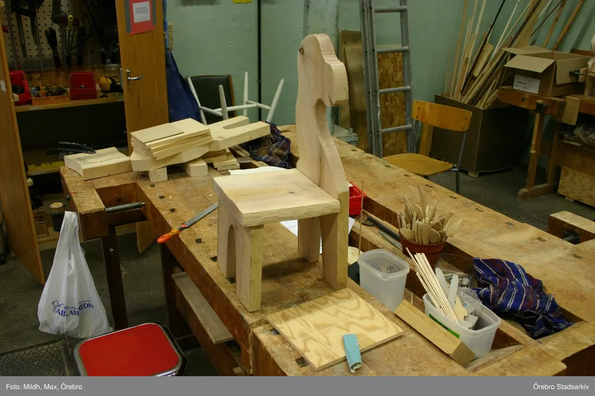 Hyvelbänk på arbetsterapin med barnstol under arbete, 2005