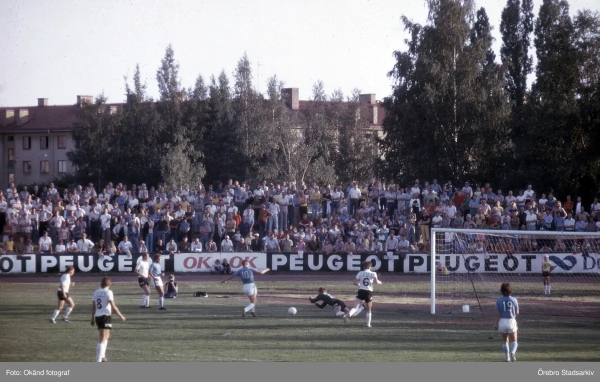 Mycket publik vid fotbollsmatch på Eyravallen, 1970-tal