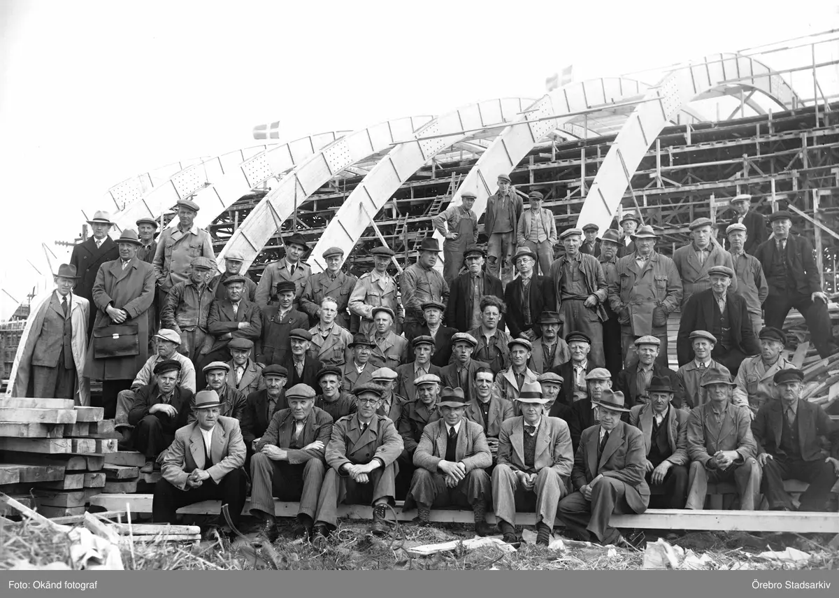 Byggnadsarbetare och basar framför byggnationen av Idrottshuset, 1945