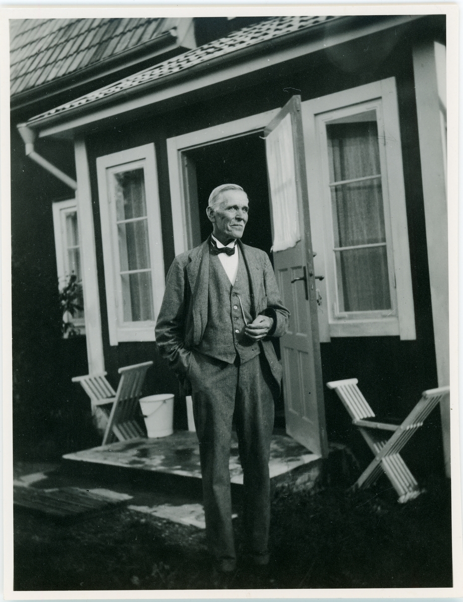 En äldre man utanför ett bostadshus, Söderby-Karl, Uppland