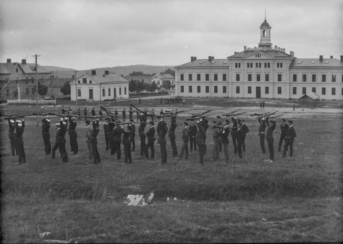 Ursprunglig bildtext: "Militärövningarna 1908. Fotograf R. L.." En grupp män deltar i militärövning på ett fält bakom Härnösands Högre Allmänna Läroverk.