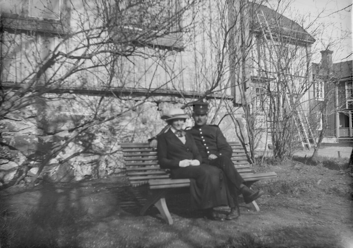 Titel: "Jag och Agda på soffan utanför Eklunds. Annandag Pingst 1914. Av R. L." Man och kvinna på trädgårdssoffa utanför bostadshus.