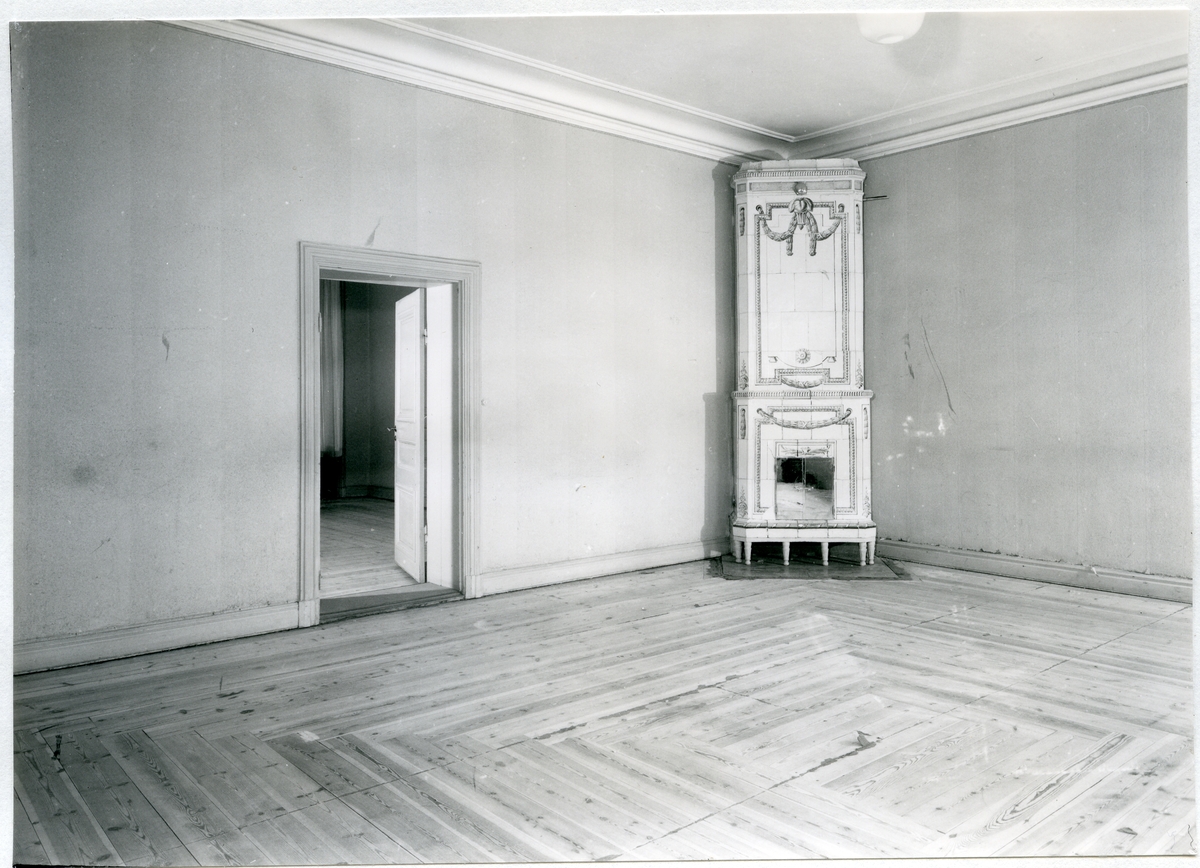 Interiör av tomt rum med rektangulär kakelugn i hörnet.