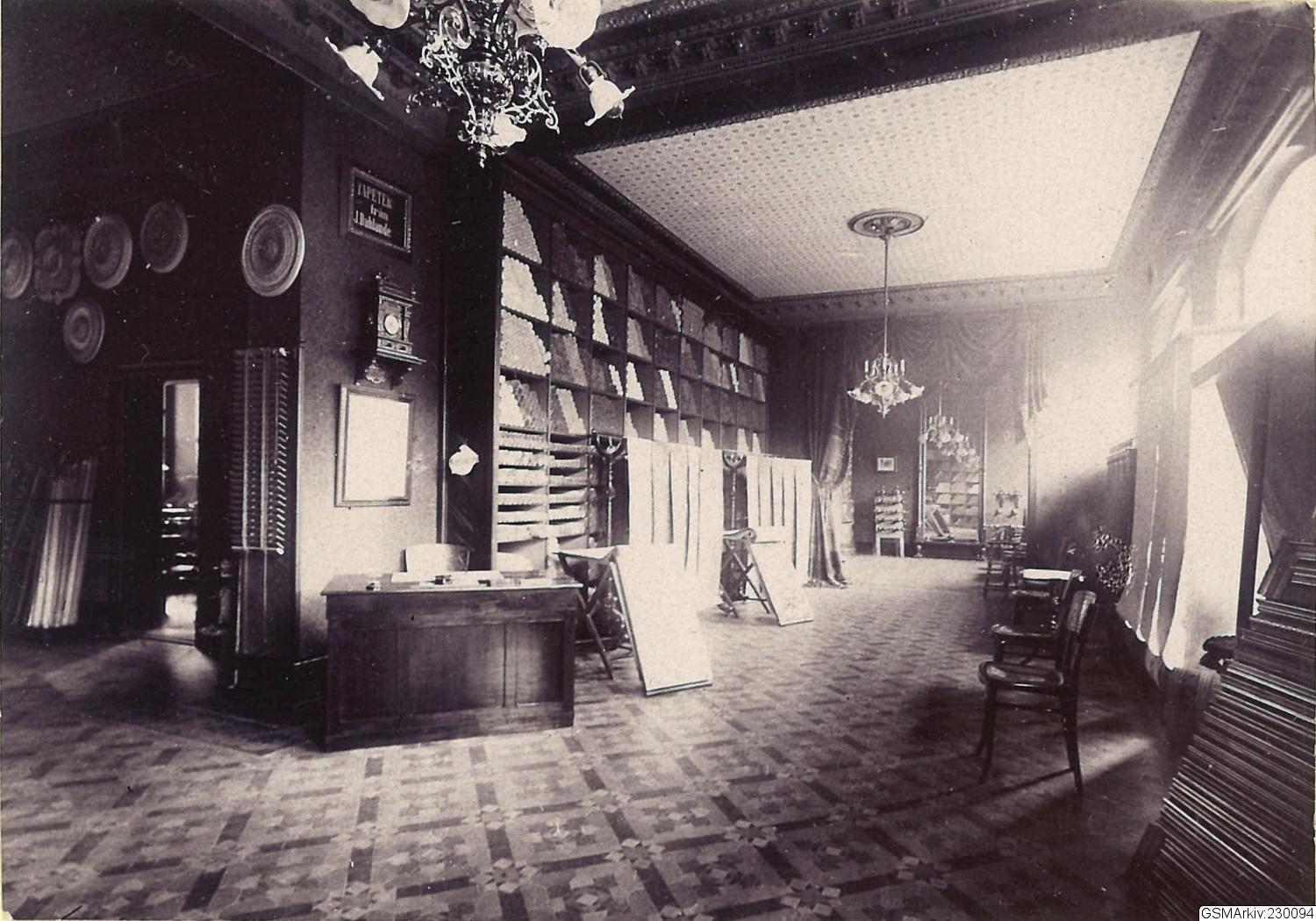 J. Dahlander & co tapetaffär (interiör) vid Södra Hamngatan 14, 1800-talet.