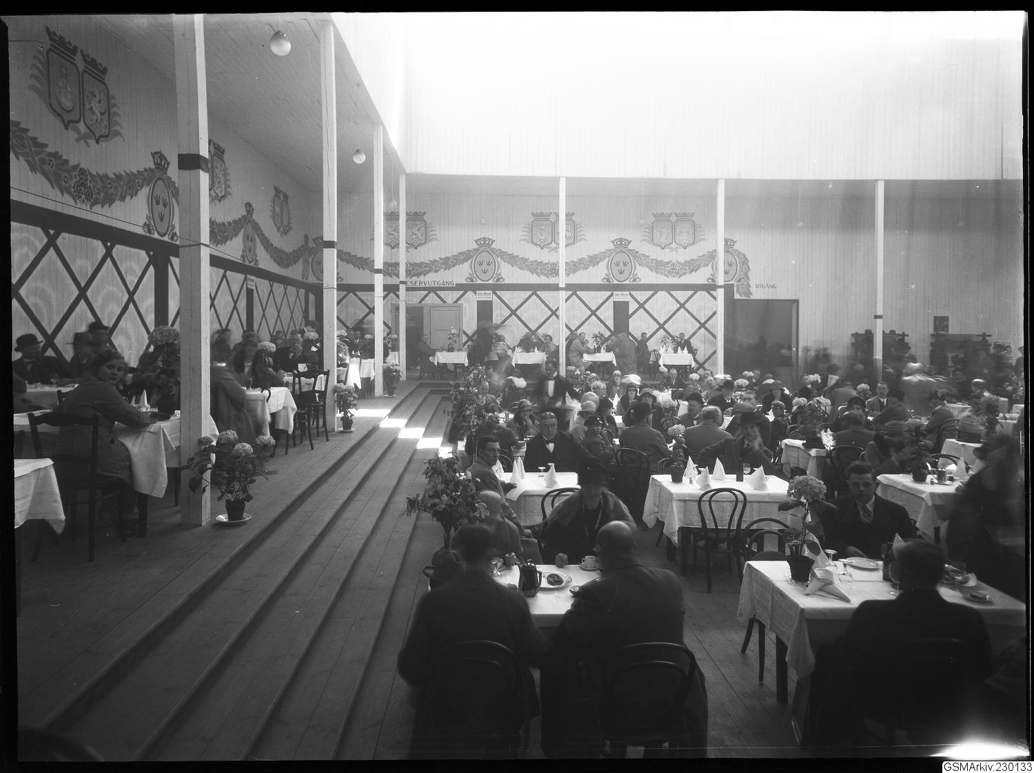 Restaurang på Svenska Mässan vid Korsvägen. Dekorationer längs väggarna med landskapscapen.