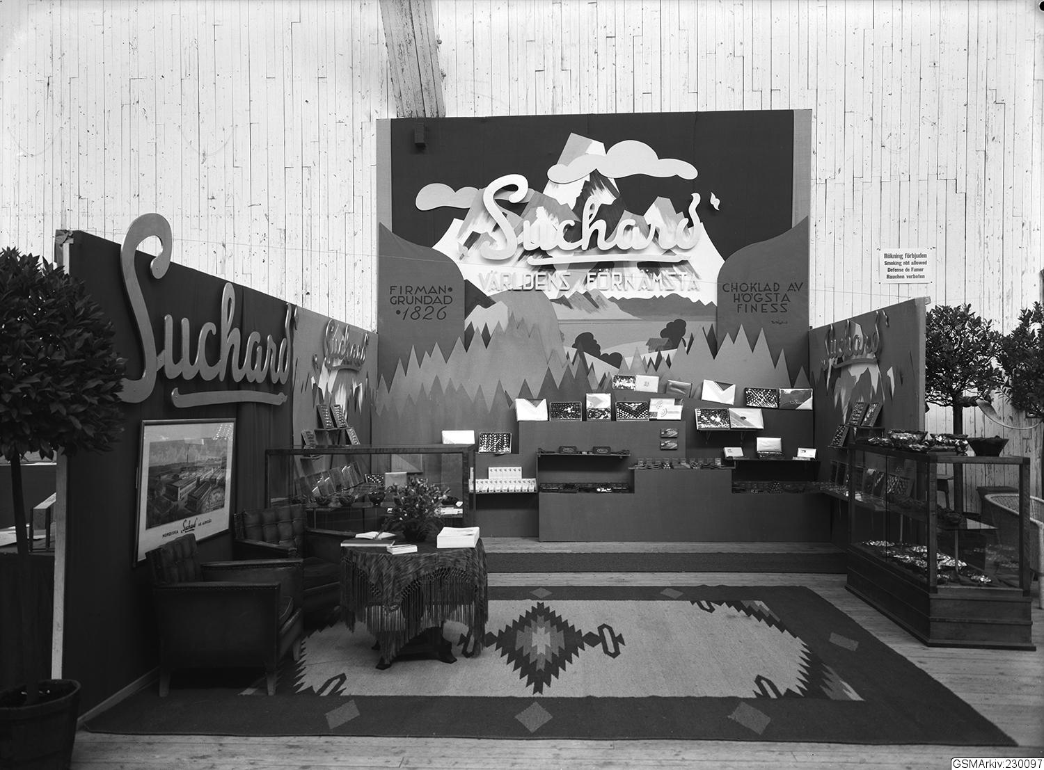 Svenska Mässan vid Korsvägen, monter från Suchard Choklad, Chocolat Suchard en av de äldsta chokladfabrikerna i Schweiz, staratdes 1826 av Philippe Suchard.