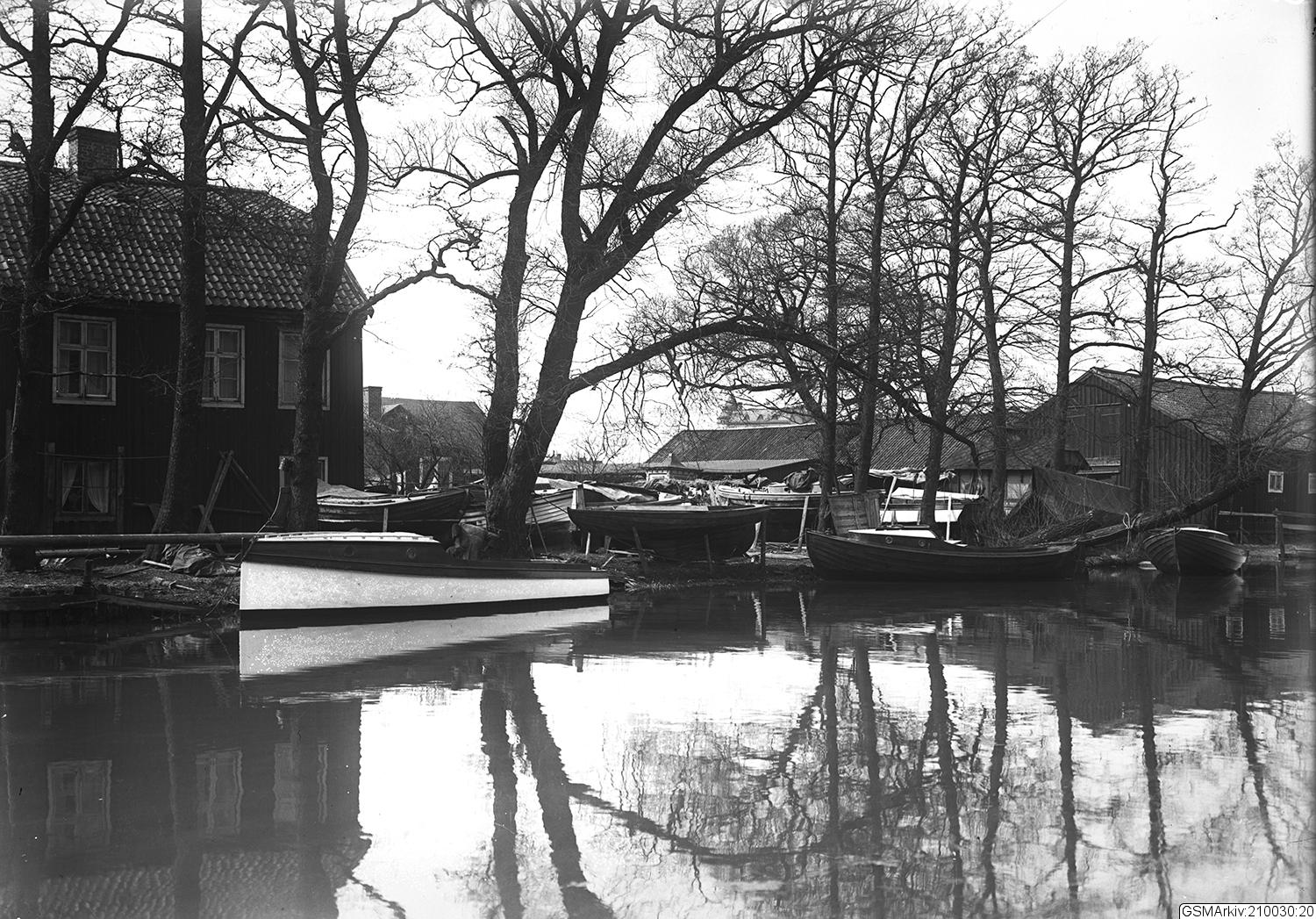 Motiv från Mölndalsån med fritidsbåtar