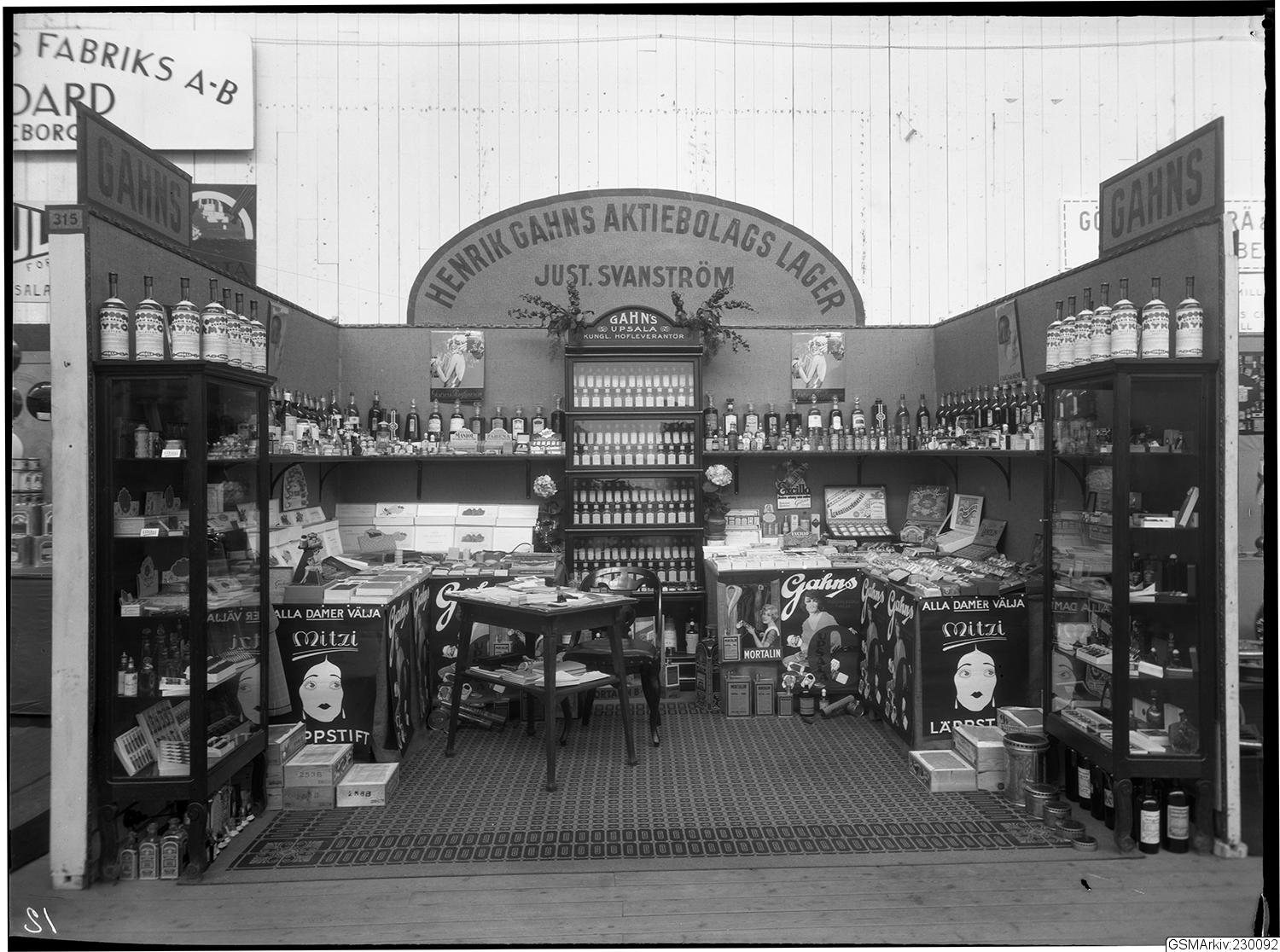 Svenska mässan, med monter från Henrik Gahns AB, kemisk-teknisk industri i Uppsala. Företaget startade i Uppsala 1867