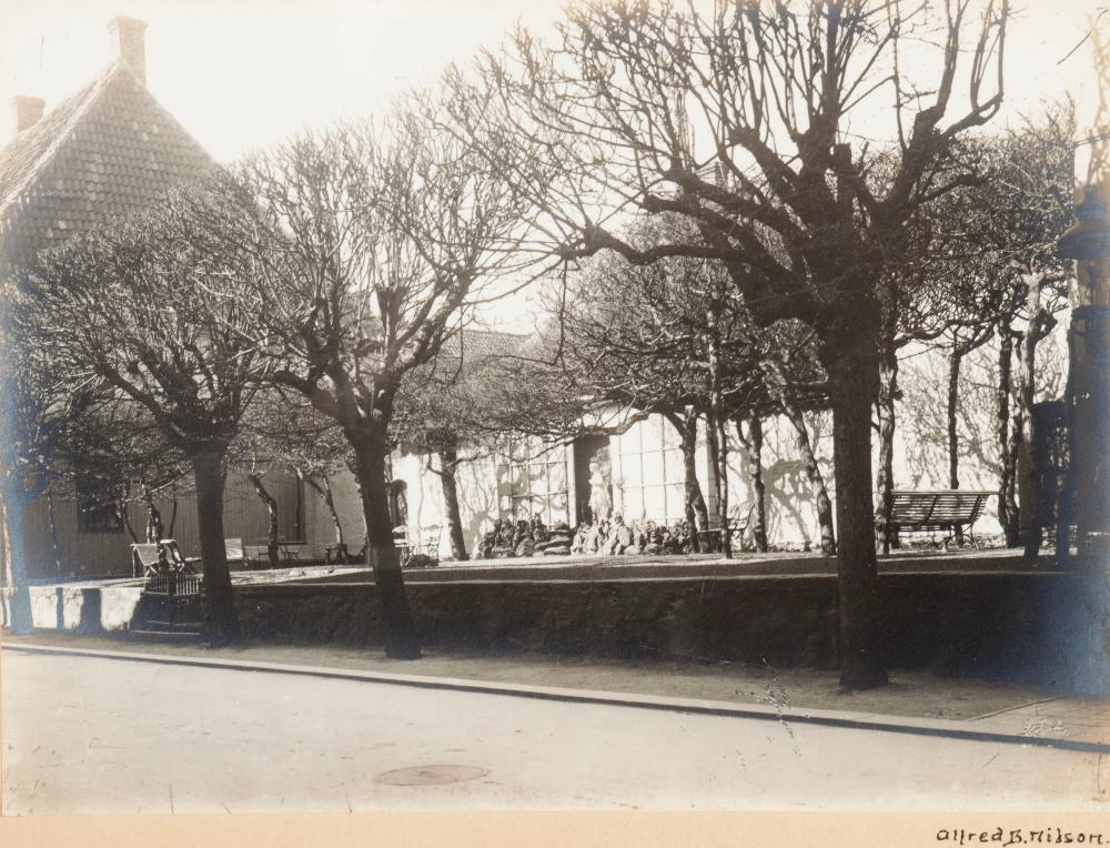Svartvitt fotografi inom glas och ram föreställande Henckels trädgård Norra Storgatan 12 Helsingborg