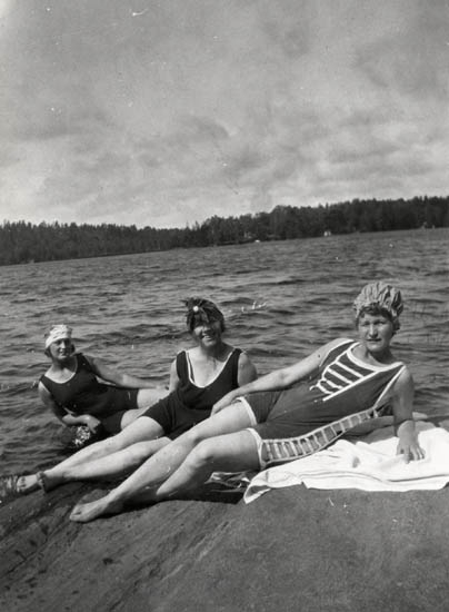 Tre unga kvinnor iklädda baddräkter, och badmössor på en klippa.