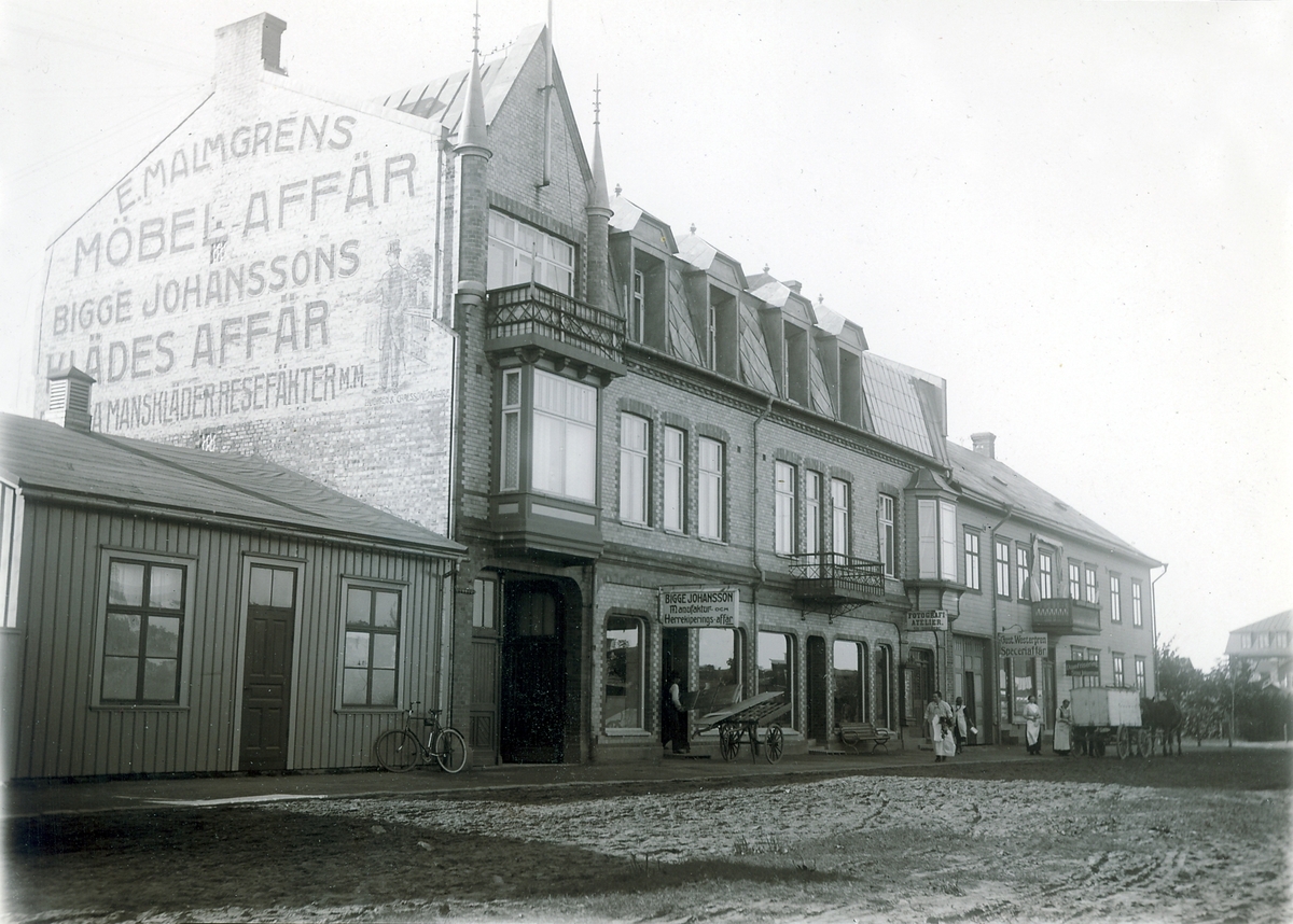 Ur byggmästare Johannes Nilssons fotoalbum från 1914. Torggatan 4, kv Holger i Falkenberg som Nilsson uppförde 1907. Gaveln används som reklamplats både för E. Malmgrens Möbelaffär och Bigge Johanssons Klädesaffär, vilken förstärks av en målad proper herre i cylinderhatt. I huset inryms också en fotoateljé, vars glastak mot norr ses över burspråket till höger. Bottenvåningens korgbågade fasadöppningar i jungendstil blandas med medeltidsromantiska toureller med höga spiror flankerande balkongen över burspråket till vänster. I trähuset på hörnet mot Holgersgatan ligger Gust. Westergrens Speceriaffär.