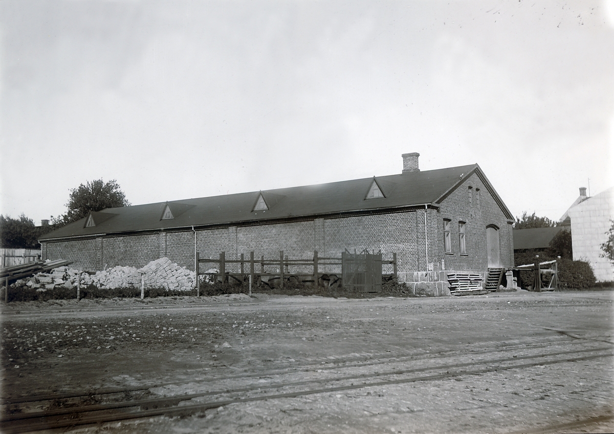 Ur byggmästare Johannes Nilssons fotoalbum från 1914. Magasinsbyggnad uppförd 1904 i tegel till Stockholms Superfosfat Fabriks AB på Hamngatan 27 i Falkenberg, kv Slottshagen. I förgrunden ses räls för godsvagnar.