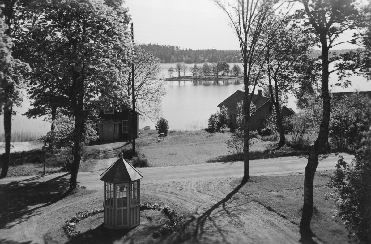 Utsikt från Alebo pensionat över sjön Unnen, där några stugor ligger längs sjökanten. I förgrunden det lilla åttakantigt brunnshuset i en rundel, vars källa är anledningen till att Alebo hälsobrunn och badanstalt anlades här. Avsett för vykort.