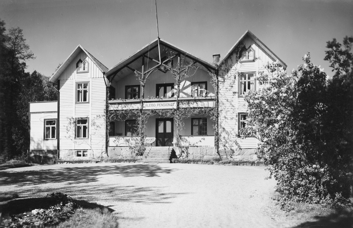 Exteriörbild av Alebo Pensionat i Södra Unnaryd. Byggnadens centrala del har en bred indragen balkong i två våningar där en klätterväxt slingrar sig. Till höger i bild står en blommande syrenbuske. Avsett för vykort.
