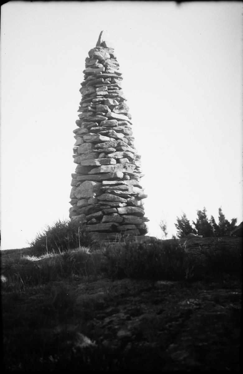 Smalt och högt stenröse staplat av flata stenskärvor. Möjligen är det röset på Skarabjär som var en gränspunkt för Vagnabäcks utmark.