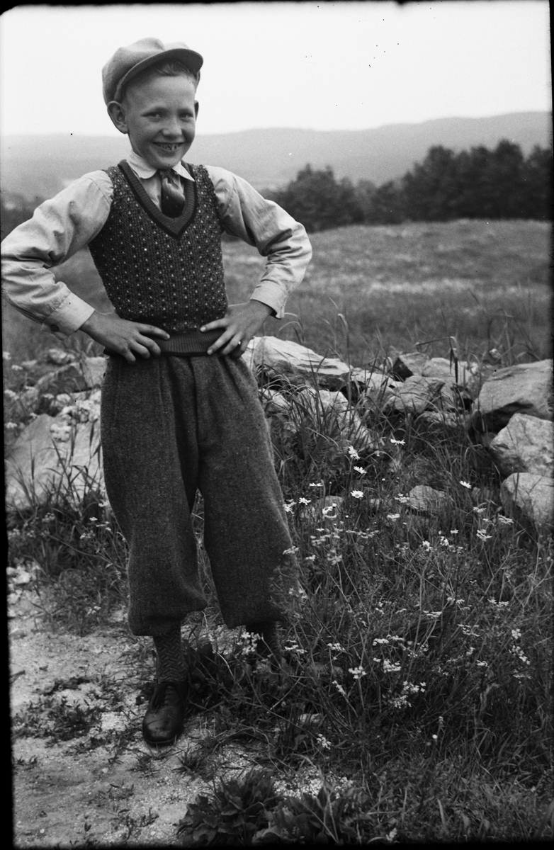 "Husa-Karls" pojk står vid en stengärdsgård klädd i golfbyxor och stickad väst över skjortan med slips och keps.