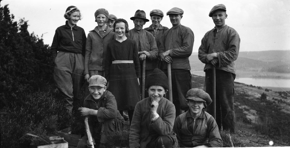 Posering vid plantering. August Snygg i Järlöv i mitten, omgiven av hjälpande ungdomar uppe på en höjd med ett vattendrag nedanför. Nedtill ses trädplantorna i små träbackar.