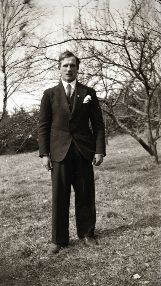 Verner Snygg står i trädgården i tredelad kostym med ett märke på kavajslaget och näsduk i bröstfickan.